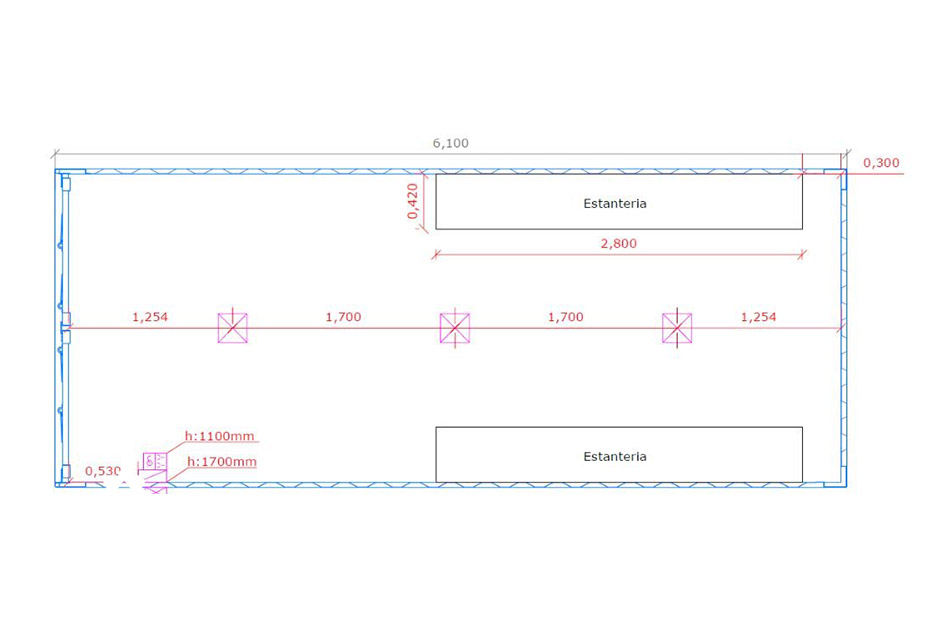 • Estanterías de 2.8 x 0.4 metros. Lateral.
