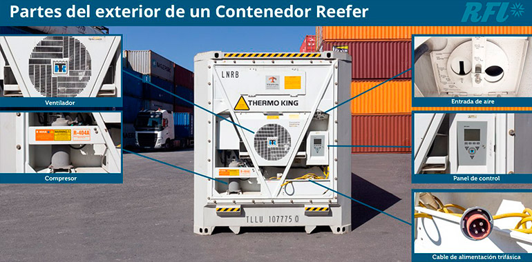 En la parte frontal de una unidad reefer encontramos, entre otras cosas el compresor y los diferentes motores, la abertura de ventilación (que suele cerrarse para cargas congeladas) y el panel de control. Desde aquí se pueden introducir los parámetros necesarios que regularán las condiciones interiores del contenedor en aspectos como la temperatura, la ventilación, el grado de humedad.