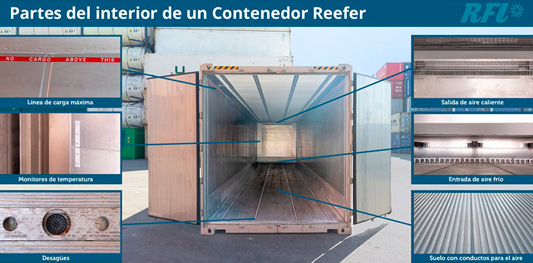 También para favorecer el correcto flujo de aire, el suelo es metálico y está formado por una serie de surcos en forma de T, que pueden discurrir abiertos o cerrados y que permiten crear una serie de corredores por los que el aire circula por debajo de la carga. En el fondo del contenedor reefer encontramos dos aberturas. La inferior es la encargada de suministrar aire frío al circuito y la superior se utiliza para recoger el aire, ya caliente tras haber recorrido el contenedor. La rejilla superior es la que alberga, en caso de que deban utilizarse, los filtros para captar el etileno que producen algunas frutas en su proceso de maduración. La parte inferior, suele contar también con una placa deflectora. Como si se tratara del alerón de un avión su misión es dirigir el aire frío que produce la unidad de refrigeración hacia el punto adecuado. Además, suelen disponer de una serie de dispositivos que se encargan de monitorizar la temperatura y las condiciones del interior del contenedor. El contenedor reefer tiene varios desagües ubicados en los extremos del suelo, que permiten liberar cualquier exceso de agua, producido principalmente por la condensación. Estos desagües pueden mantenerse abiertos o cerrados con tapones en función del tipo de carga que vayamos a transportar y la temperatura. Generalmente se cierran cuando se va a utilizar la unidad para el transporte de mercancía congelada.